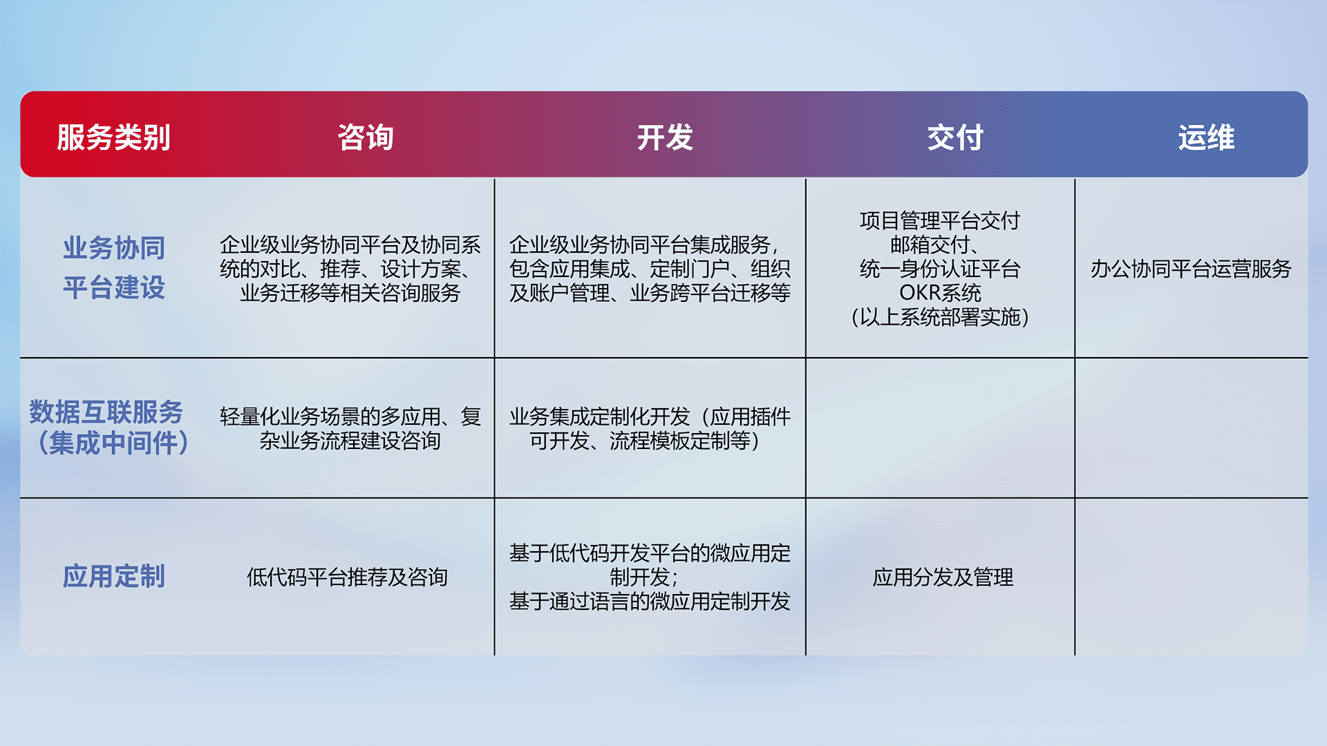 针对钉钉、、、、企微、、、、IDaas等平台级产品提供产品的规划、、、、方案、、交付、、定制化开发等服务,,实现如统一协同办公、、智能客户服务、、、混合会议管理、、、、智能数据查询、、、等业务场景,,,实现数字化转型。。。