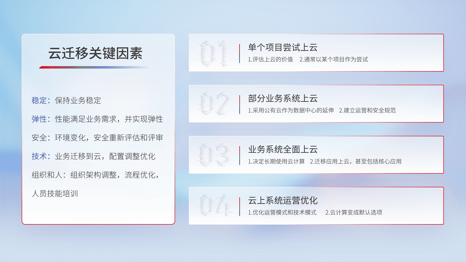 结合实际业务,,,从规划设计、、、、云平台选型、、云原生改造、、、数据迁移、、、集成交付,,迁移全过程为客户识别最佳上云路径,,,做好风险识别管理,,,设计网络架构、、身份权限、、、、安全审计合规、、操作审计、、、日志审计、、监控告警策略、、多站点容灾设计等,,,,对云上基础设施进行整体规划,,提升IT治理水平,,,以满足弹性、、、、高可用、、高性能的需求。。。