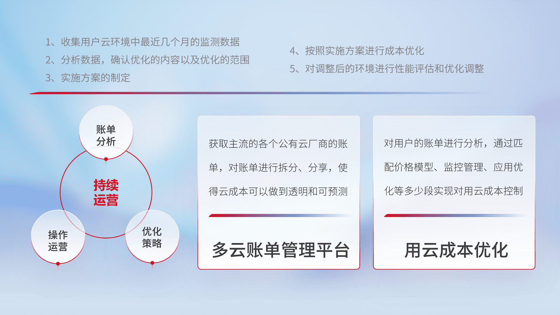 通过多云纳管,,以统一的资源数据模型把客户的云资源进行抽象和封装,,进而实现对多云资源的统一操作,,保障云资源管理的可靠性、、、、稳定性与可用性。。量身定制化运维内容,,,,配置、、、、开发运维、、、补丁管理、、、备份、、、、监控、、认证和访问管理、、、审计和日常巡检等,,保障在用云过程中的可靠度,,,稳定度以及高可用率。。